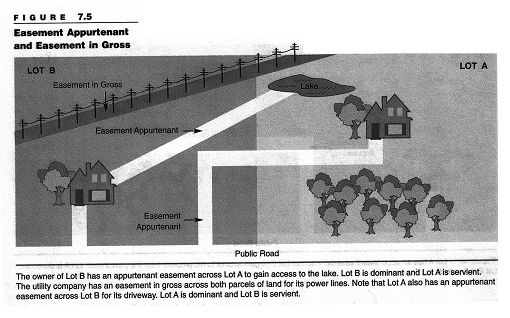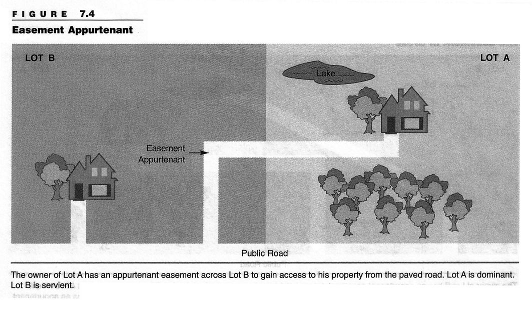 An appurtenant easement is annexed to the ownership of one parcel and allows this owner the use of a neighbor's land. For an appurtenant easement to exist, two adjacent parcels of land must be owned by two different parties. The parcel over which the easement runs is known as the servient tenement; the neighboring parcel that benefits is known as the dominant tenement. (See Figure 7.4 and Figure 7.5.)