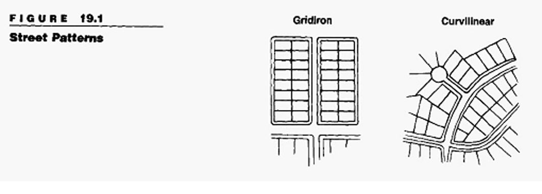 By varying street patterns and clustering housing units, a sub-divider can dramatically influence the amount of open or recreational space in a development. Two of these patterns are the gridiron and curvilinear patterns. (See Figure 19.1.)