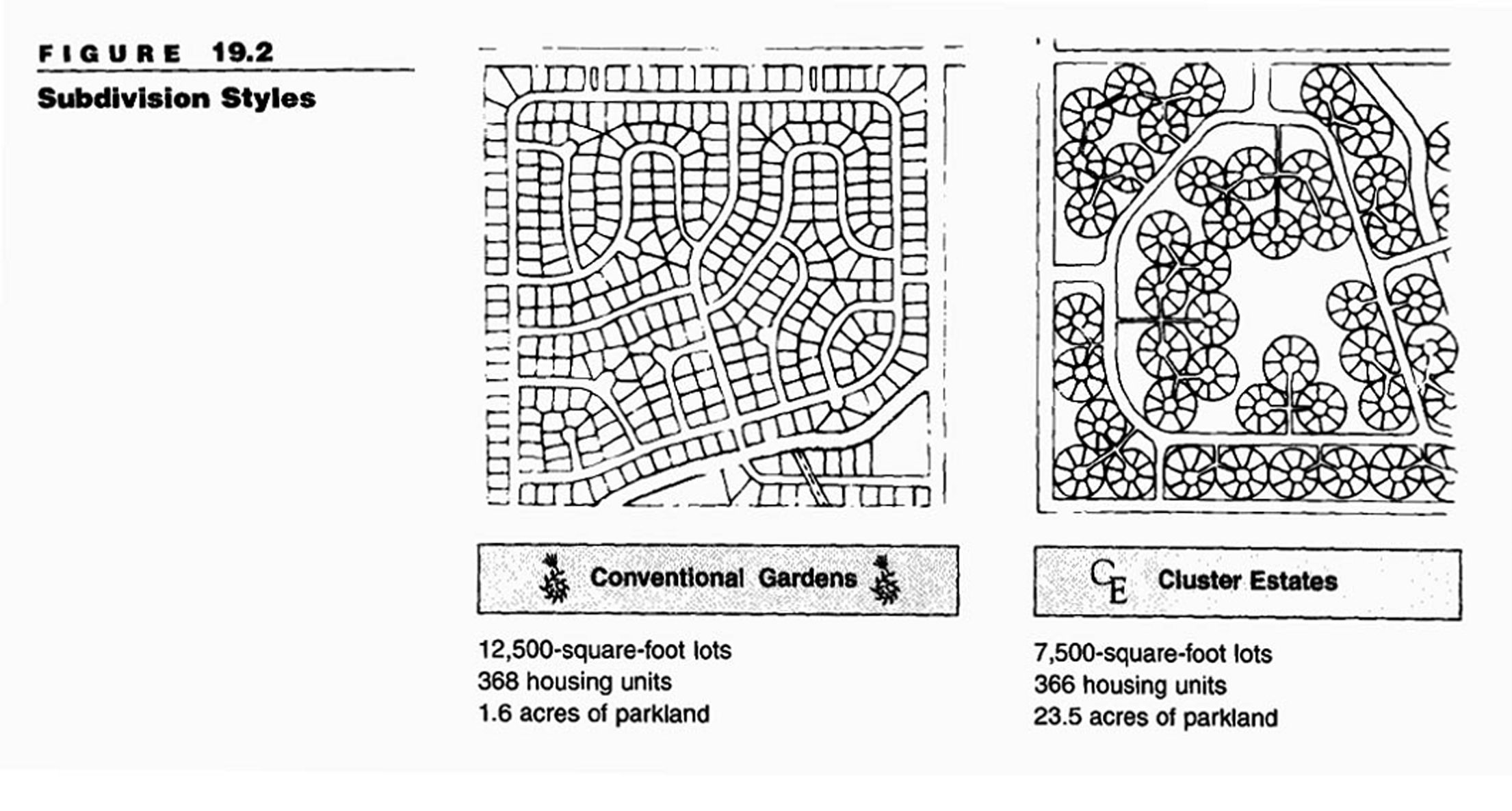 For example, compare the two subdivisions illustrated in Figure 19.2. Conventional Gardens is a conventionally designed subdivision containing 368 housing units. It uses 23,200 linear feet of street and leaves only 1.6 acres open for parkland. Contrast this with Cluster Estates. Both subdivisions are equal in size and terrain. But when lots are reduced in size and clustered around limited-access cul-de-sacs, the number of housing units remains nearly the same (366), with less street area (17,700 linear feet) and dramatically increased open space (23.5 acres). In addition, with modern building designs, this clustered plan could be modified to accommodate more than 1,000 town houses while retaining the attractive open spaces.
