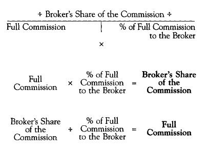 The full commission is a percentage of the sales price unless stated differently in the problem. Remember that full commission rates, commission splits between brokers, and commission splits between the broker and salespersons are always negotiable. Always read a problem carefully to determine the correct rate(s).