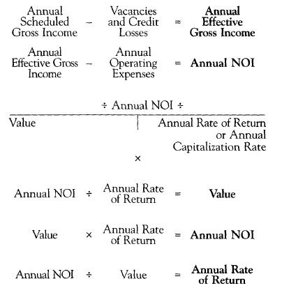 When appraising income-producing property, the value is determined by using the annual net operating income (NOI) and the current market rate of return or capitalization rate. Annual scheduled gross income is adjusted for vacancies and credit losses to arrive at the annual effective gross income. The annual operating expenses are deducted from the annual effective gross income to arrive at the annual NOI.