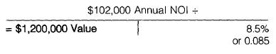 FOR EXAMPLE An office building produces $132,600 annual gross income. If the annual expenses are $30,600 and the appraiser estimates the value using an 8.5 percent rate of return, what is the estimated value?